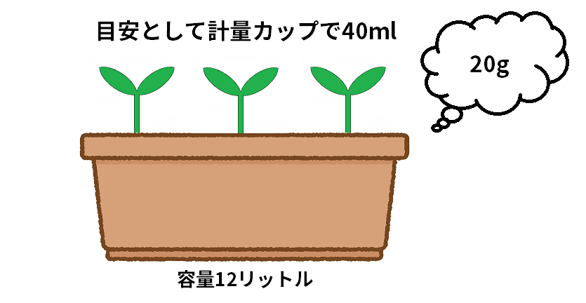 プランター1つに対して、本製品20gを作物の根本を避けて土の表面に均一に撒きます。