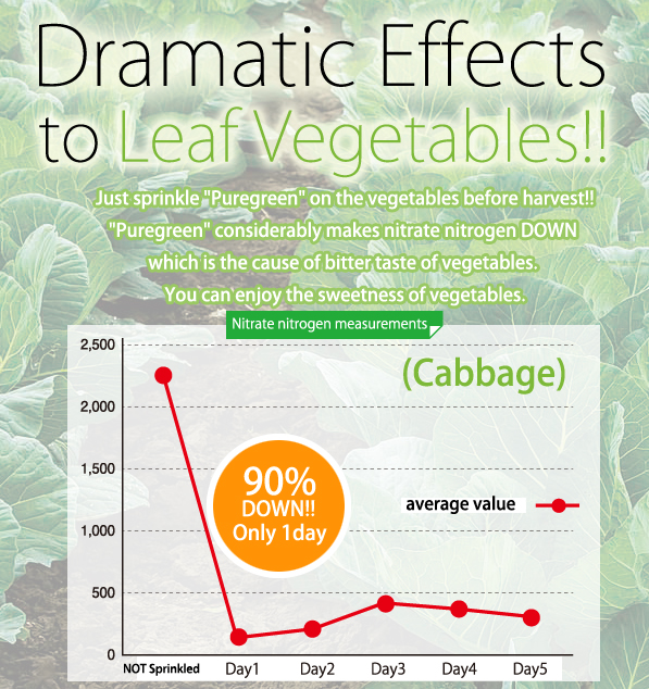 The vegetables containing much nitrate nitrogen have strong bitterness ingredient and confine the original taste of them. “Puregreen” brings out the vegetables original taste by reducing the nitrate nitrogen. Nitrate reduction test results show that when you spray “Puregreen”, “the activity of the enzyme ” and ” metabolic function of plants” is increased, and nitrate nitrogen is reduced.